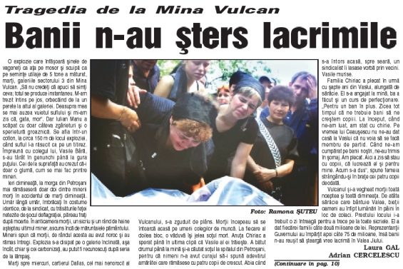 Ultima tragedie care a lovit Valea Jiului le-a amintit minerilor de toate necazurile: conditii ucigatoare de munca, salarii prea mici pentru familii atat de mari ca ale lor, sindicate care nu-si apara decat propriile afaceri si directori corupti. Unul dintre supravietuitorii exploziei de marti, in varsta de 30 de ani, a spus ca nu se va mai intoarce niciodata in locul in care si-a vazut moartea cu ochii. Dar, cu toate ororile pe care le vad, tinerii din Vale ar da orice sa ajunga in subteran. Copiii nostri sunt disperati ca nu au unde sa lucreze. Si cand se vor ridica ei, mineriadele vor parea o joaca", spunea un sef de echipa de la Vulcan.