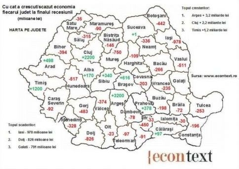 Econtext.ro a realizat o radiografie a fiecărui judeţ, calculată în bani. Mai exact, site-ul prezintă o analiză naţională şi arată unde s-a devalorizat economia şi unde a crescut ea. Perioada luată în calcul a fost începutul anului 2009 - finele anului 2010.