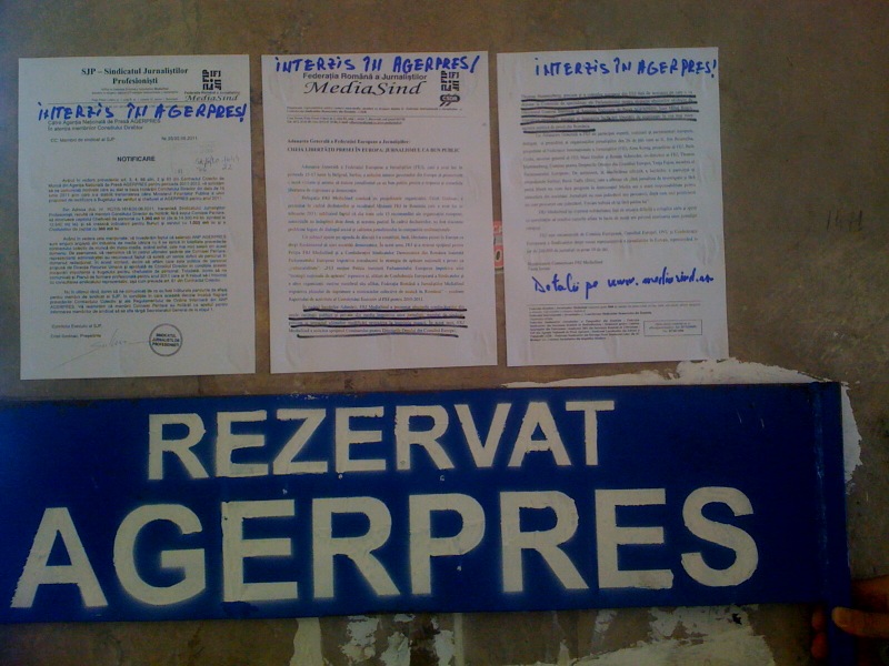Enervat la culme de faptul că membri ai Sindicatului Jurnaliştilor Profesionişti, (organizaţia care a negociat şi semnat Contractul Colectiv de Muncă din Agenţia Naţională de Presă AGERPRES pentru anii 2011-2013), au afişat la panoul de informare din cadrul instituţiei comunicatul de presă al FRJ MediaSind privind Adunarea Generală a Federaţiei Europene, a Jurnaliştilor ce a avut loc la Belgrad în 15-17 iunie a.c., directorul interimar al agenţiei, Ioan Mihai Roşca, a trecut la represalii. Acesta a ordonat paznicilor să arunce la coş toate comunicatele şi informările SJP către salariaţii agenţiei şi să ascundă panourile de afişaj.