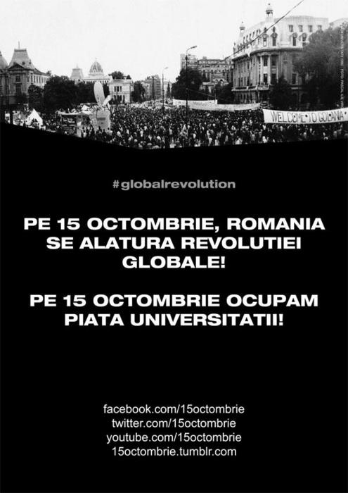 Pe cele mai importante reţele de socializare de pe Internet a lansat un apel prin care românii sunt chemaţi să se alăture, pe data de 15 Octombrie, „revoluţiei globale“ declanşată de organizaţie OWS (OWS). „Pe 15 octombrie, România se alătură revoluţiei globale. Pe 15 octombrie, ocupăm Piaţa Universităţii“ este esenţa apelului. „Nu reprezentăm niciun partid politic, asociaţie sau sindicat. Nici nu dorim să fim reprezentaţi de acestea, pentru că fiecare din noi vorbeşte în numele său. Vrem că pe 15 octombrie, uniţi într-o singură voce, să le reamintim politicienilor că ei servesc interesele noastre, ale cetăţenilor, şi nu pe cele personale“, se arată pe pagina de Facebook special creată pentru iniţierea mişcării „Ocupăm Piaţa Revoluţiei“.